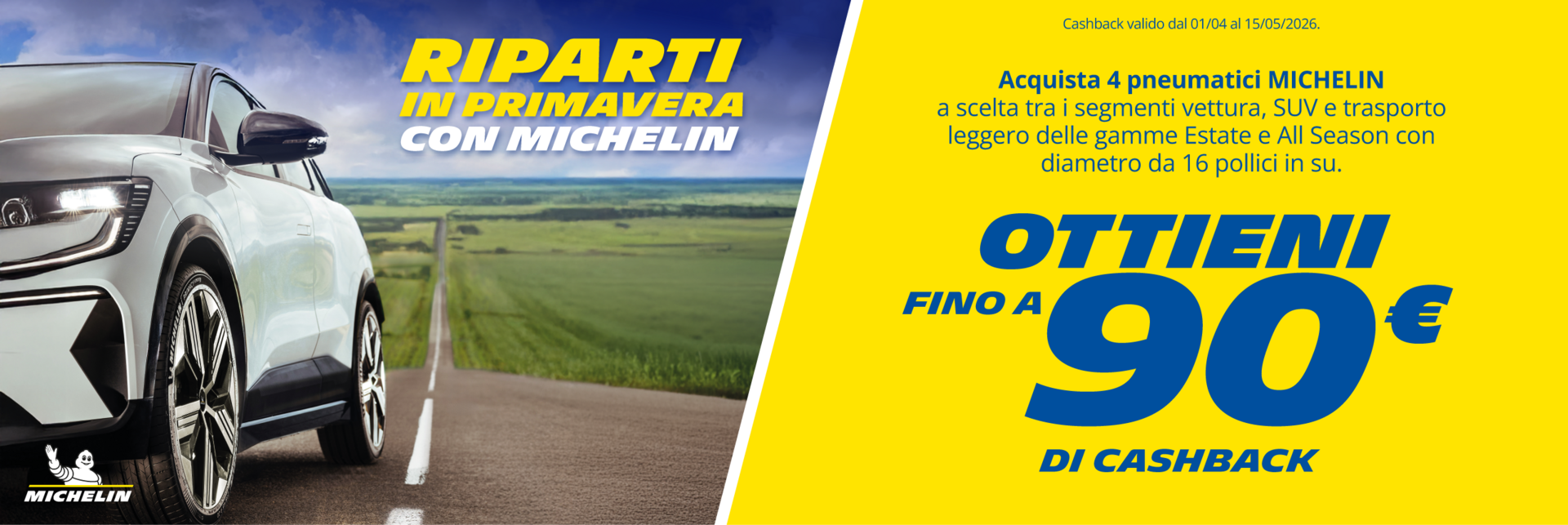 Dal 01 Aprile 2026 al 15 Maggio 2026, recati in un rivenditore aderente ed acquista almeno un set di 4 pneumatici dei segmenti vettura, SUV e trasporto leggero delle gamme Summer o All Season, con diametro da 16 pollici in su. Per le gamme All Season si intendono le gamme MICHELIN CrossClimate.